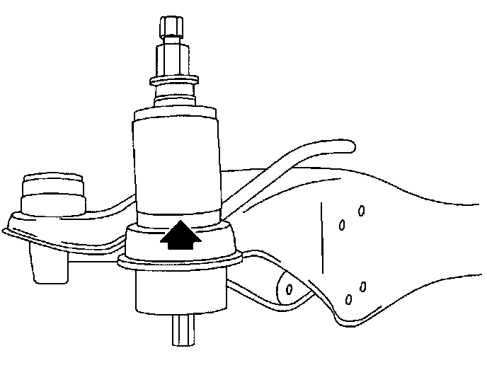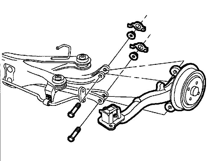 5. Remove upper and lower control arm to rear axle control arm attachment bolts, discard bolts and nuts.
