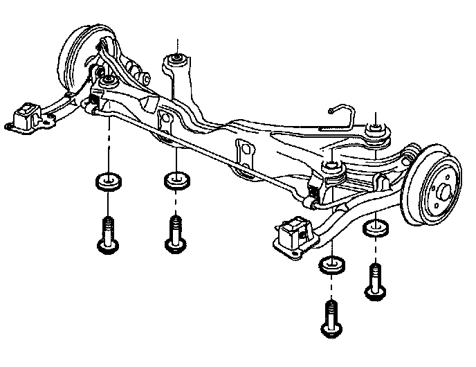 1. Raise rear suspension support assembly into vehicle and install using new bolts.