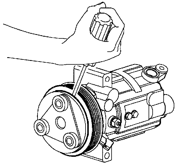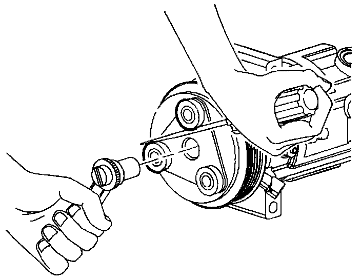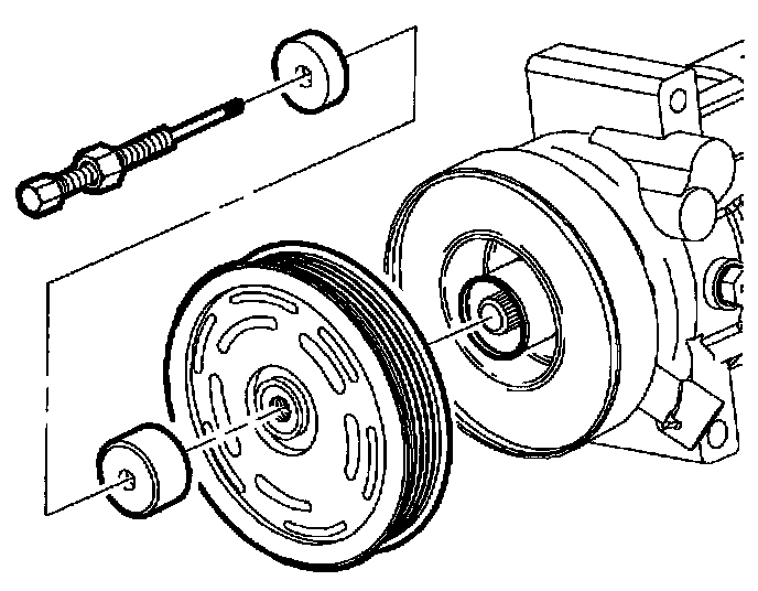 4. Hand tighten nut on installation bolt to align pulley to A/C compressor. While holding end of bolt, tighten nut until pulley bottoms out on A/C compressor.
