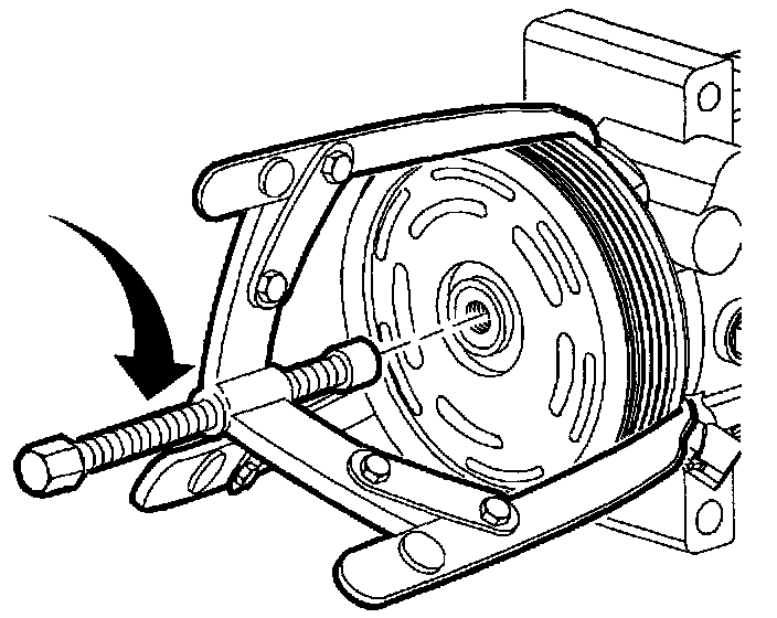 6. Install three-jaw puller on A/C compressor pulley. Tighten center bolt to remove pulley assembly.