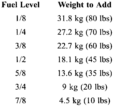 3. If vehicle fuel tank is not full, the chart shown may be used to determine amount of weight necessary to be added to the trunk of vehicle to simulate a full fuel tank.