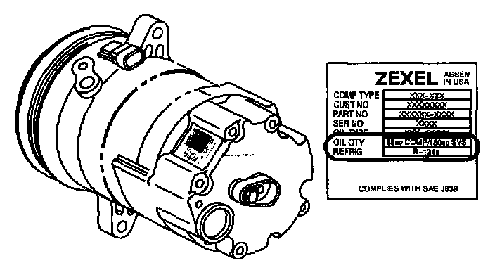 BALANCING COMPRESSOR OILNOTE: PAG oil charge can be identified by locating the label on the rear of A/C compressor. (220 cc oil charge in the total system for the model year serviced.) Improper quantity of oil charge in the system will degrade performance.