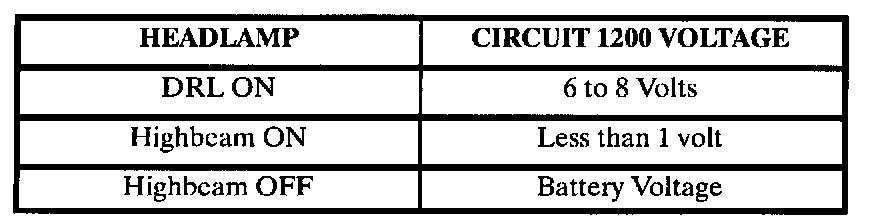 For DRL operation, the parking brake must be fully released, the ignition switch must be in the RUN position and headlamp switch must be in the Off position. Under normal operating conditions, the feedback voltage to the BCM measured at circuit 1200 is: