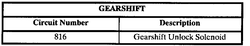 The gearshift unlock solenoid is energized by the BCM switching circuit 816 to ground. When energized, the gearshift unlock solenoid will allow shifting from PARK. A condition for shifting from PARK is that the foot brake must be applied. The BCM receives this information over the serial data link from the engine controller.
