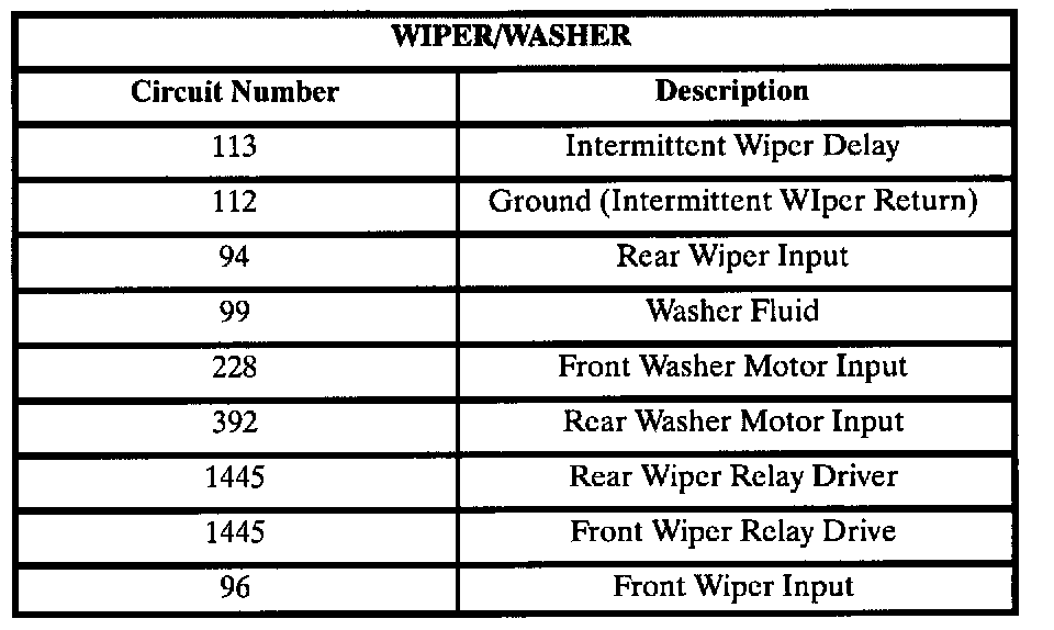 When operation of the rear wiper is selected, battery voltage from the rear wiper switch is applied to the rear wiper input of the BCM circuit 94. The BCM responds by switching circuit 1445-to-ground. This action energizes the rear wiper relay, providing power to the rear wiper motor.