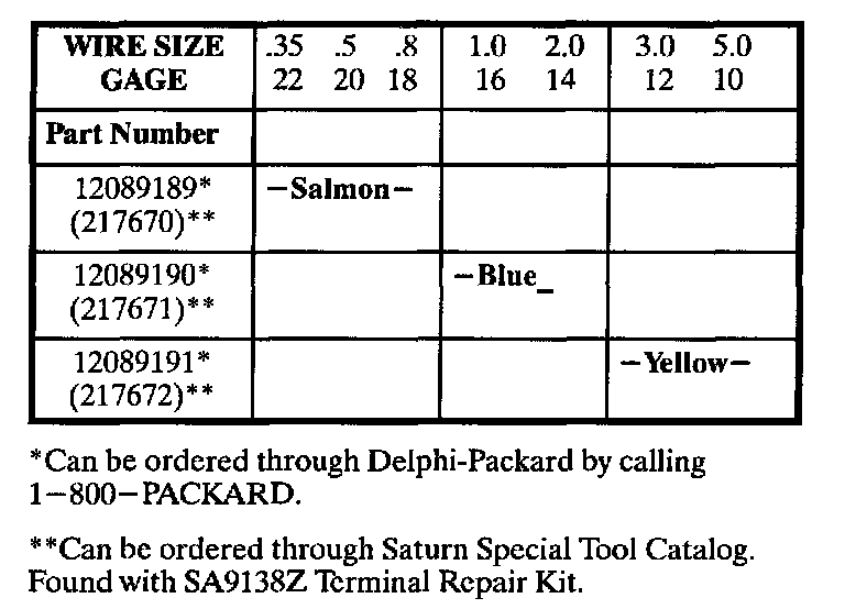 With the low current and voltage wires in the Saturn vehicle, it is best to use approved Packard Electric Crimp and Seal Splice Sleeves (or equivalent).