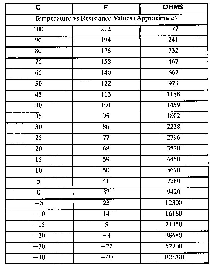 The following chart lists the resistances of engine coolant temperature sensor as compared to temperature.
