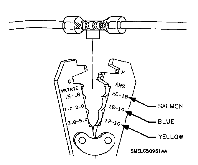 7. Using a Saturn approved crimp and seal sleeve (found in special tools kit SA9138Z) position stripped ends of wires in sleeve until wires hit stop.