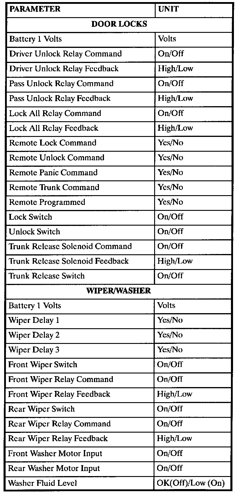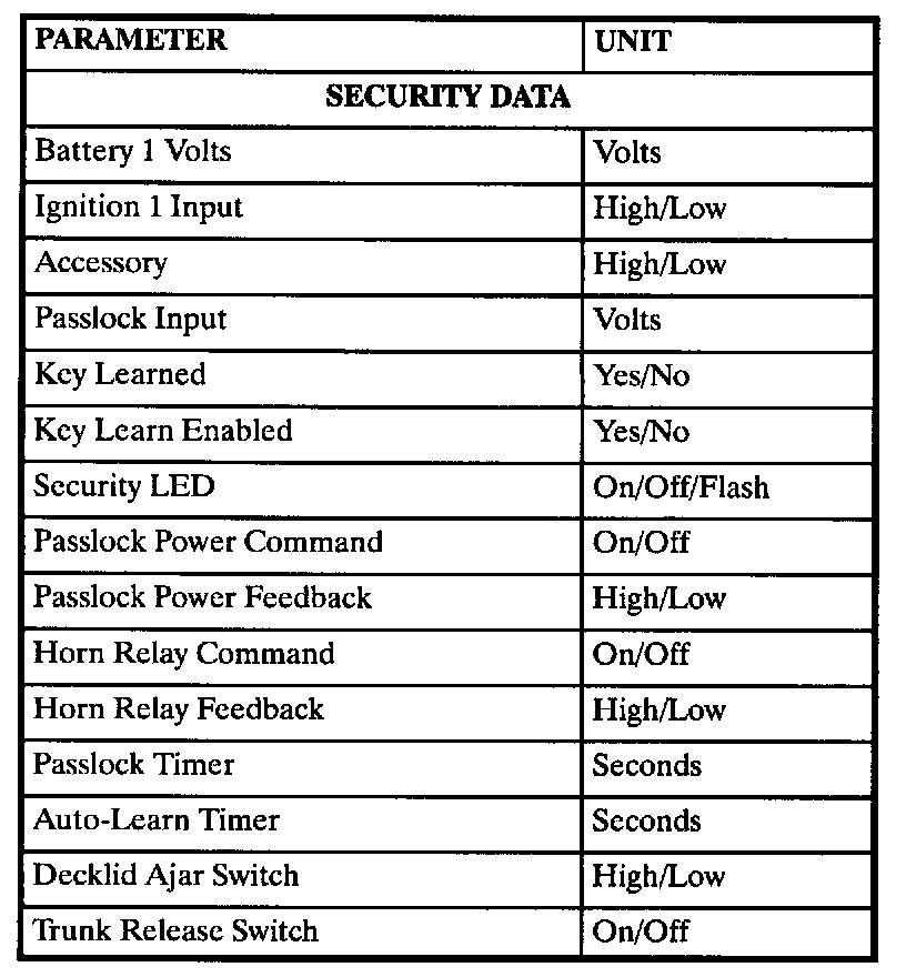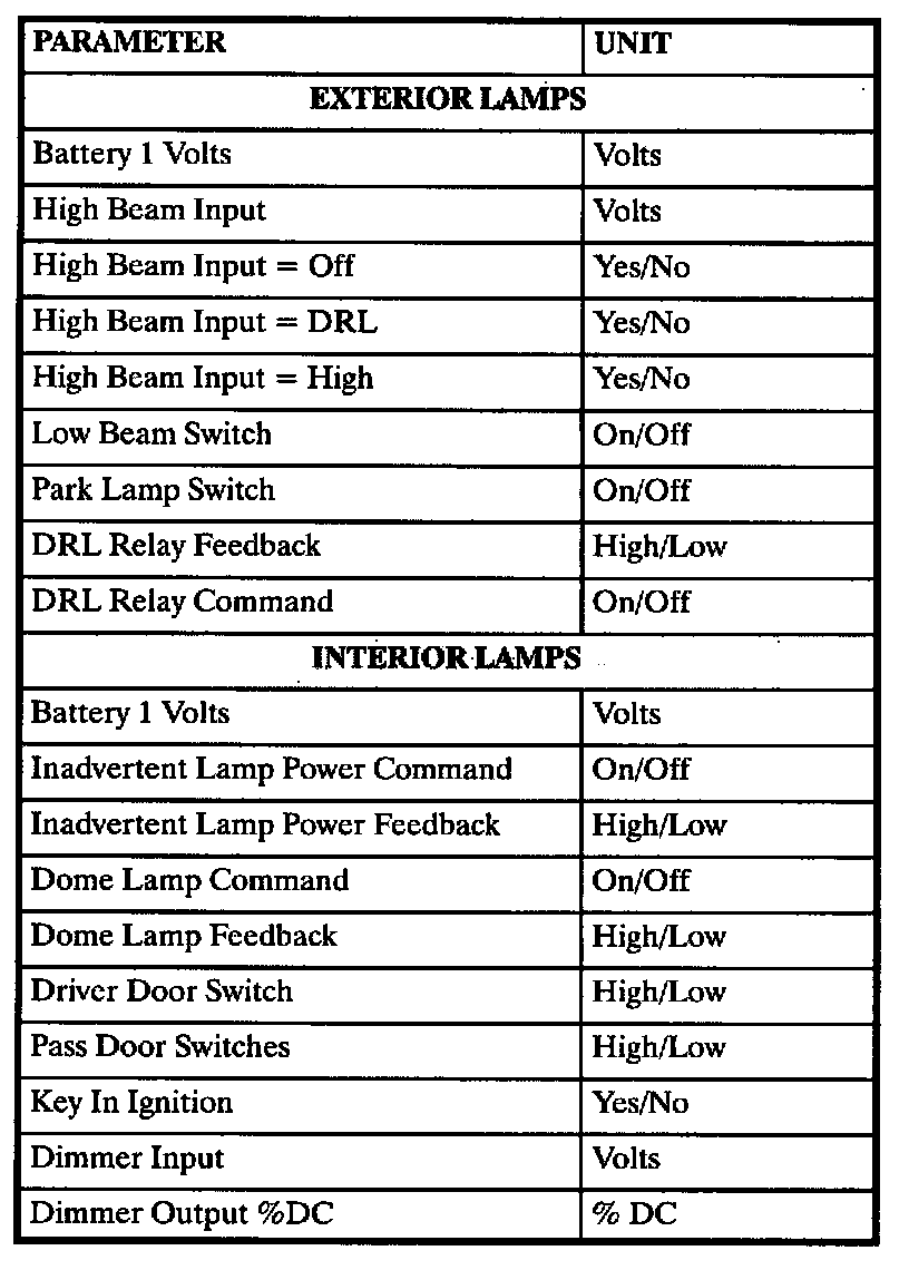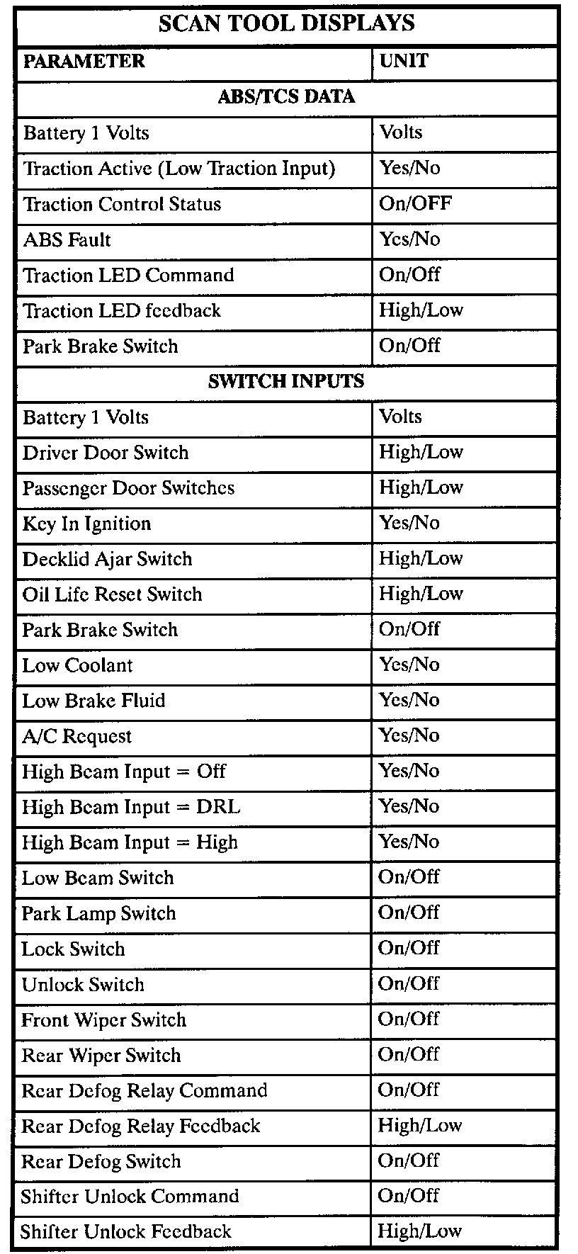 The table lists the parameters displayed by the Scan tool. The parameters are displayed by ABS/TCS data, switch inputs, exterior lamps, interior lamps, door locks, wiper/washer and security data groups.