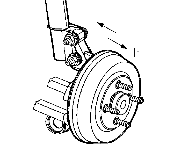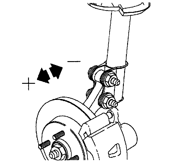 1. Loosen two strut to knuckle fasteners and pull or push on knuckle in the direction of desired camber change. This will allow up to 1.5 degrees of camber adjustment.