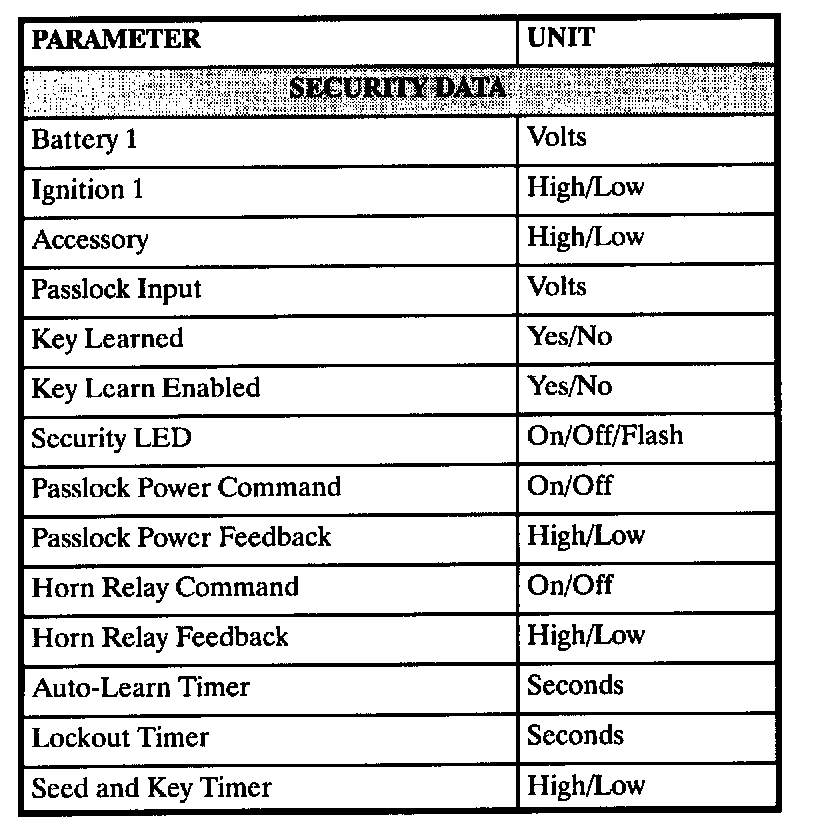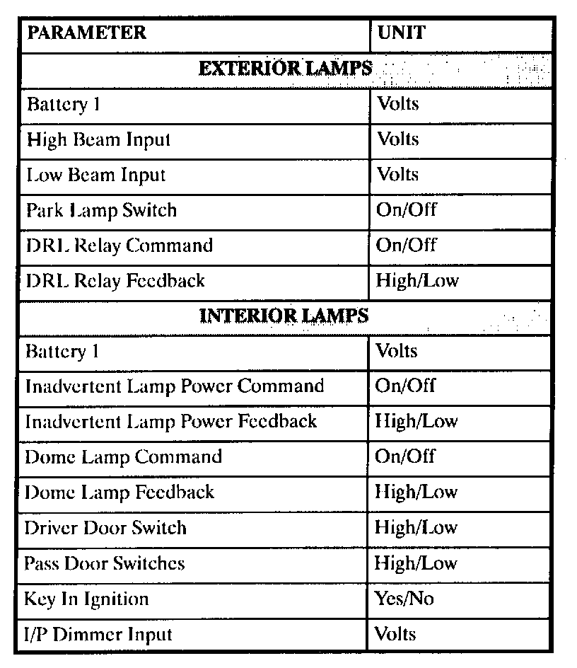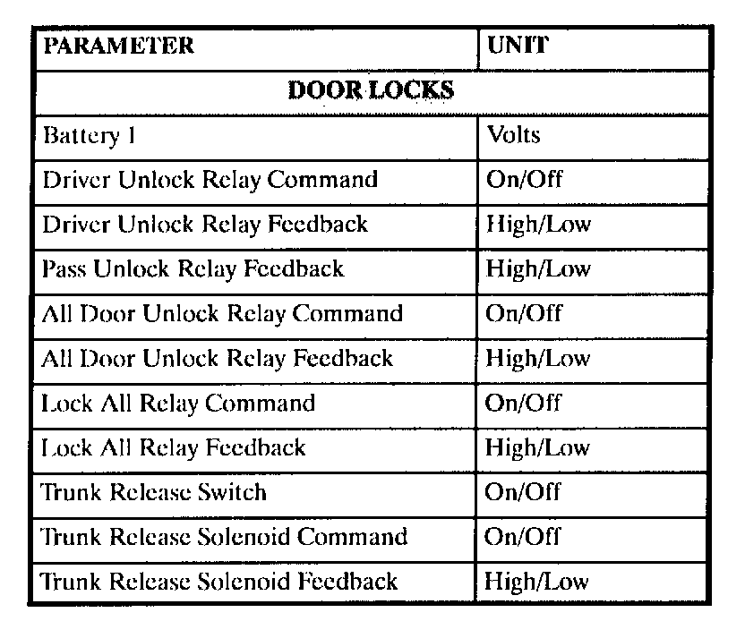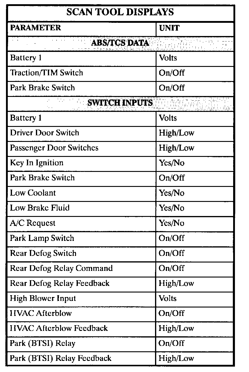 The table lists the parameters displayed by the Scan tool. The parameters are displayed by ABS/TCS data, switch inputs, exterior lamps, interior lamps, door locks, and security data groups.