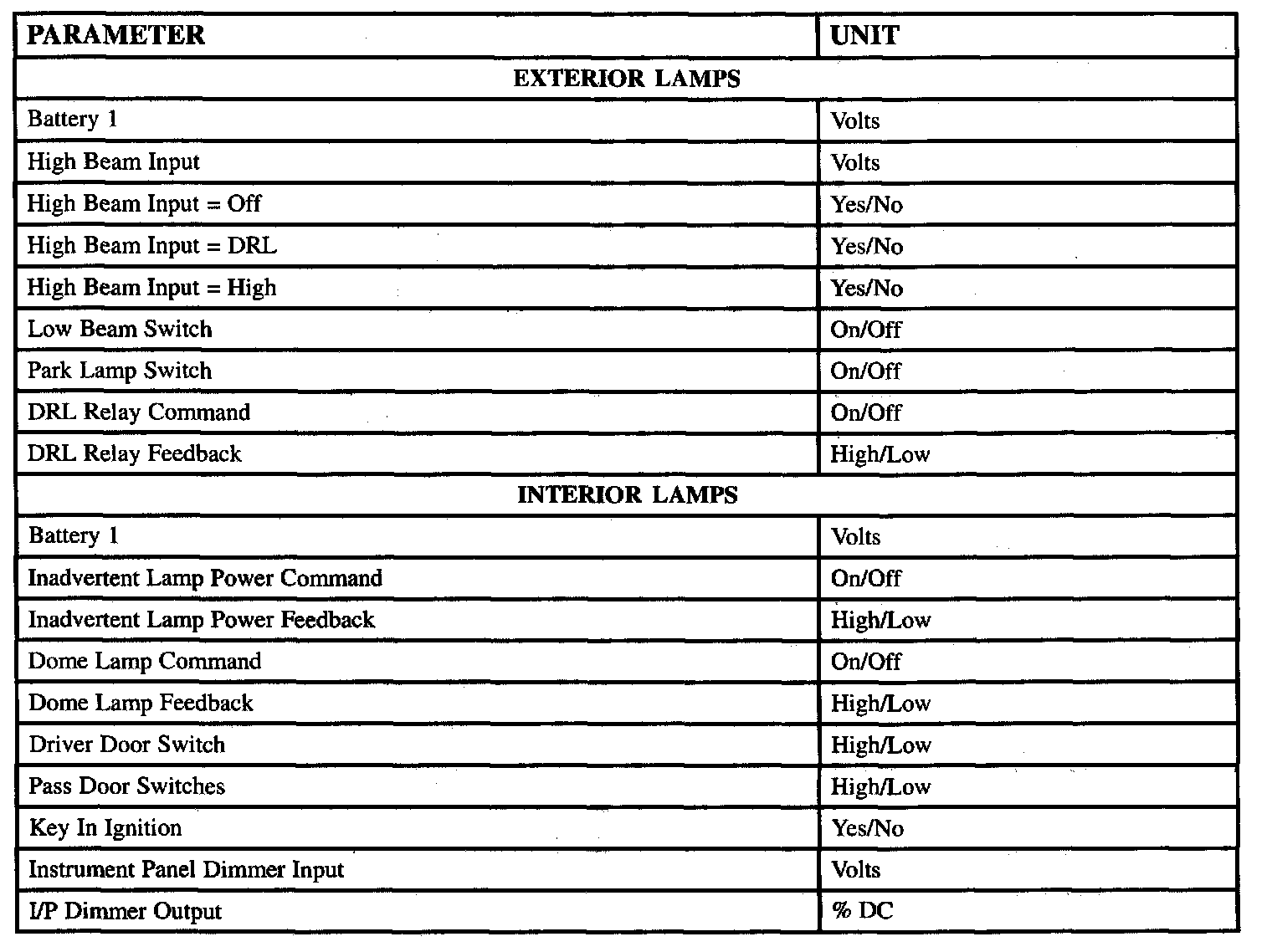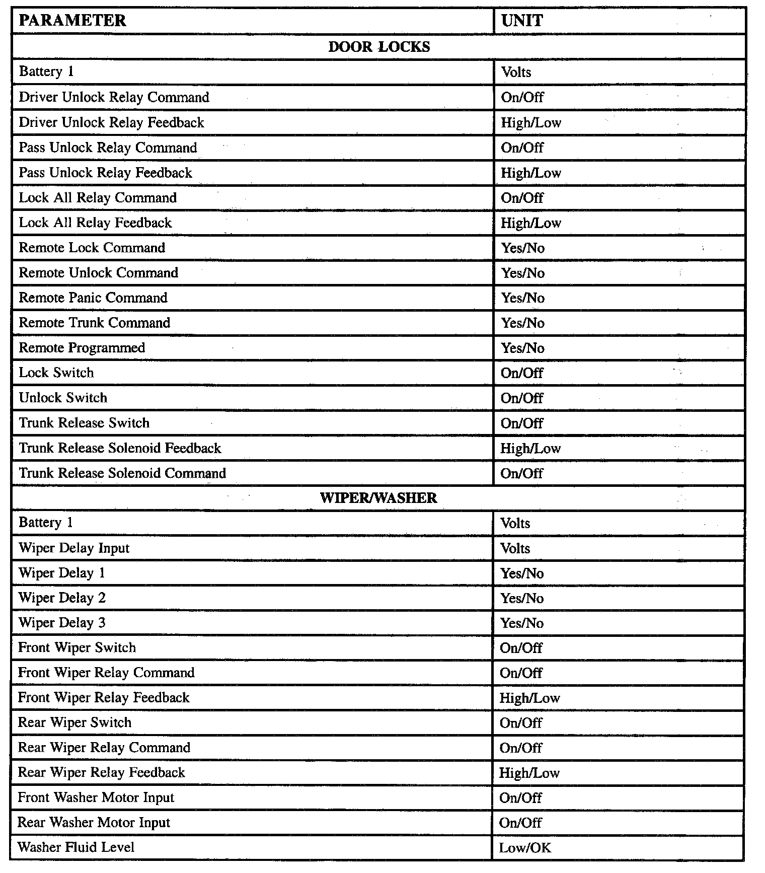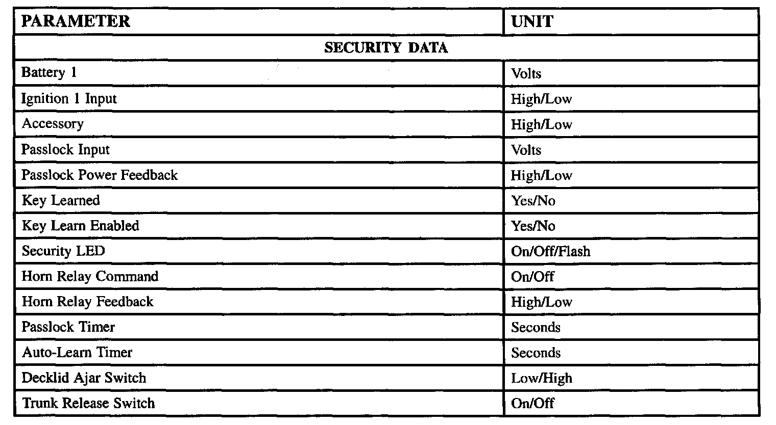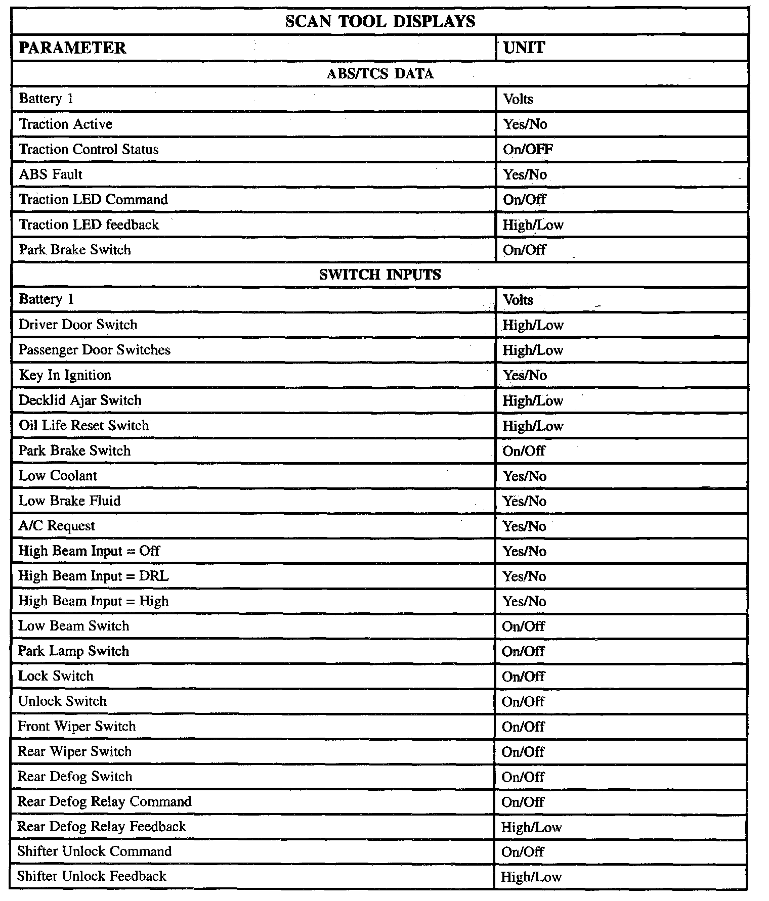 The table lists the parameters displayed by the Scan tool. The parameters are displayed by ABS/TCS data, switch inputs, exterior lamps, interior lamps, door locks, wiper/washer and security data groups.