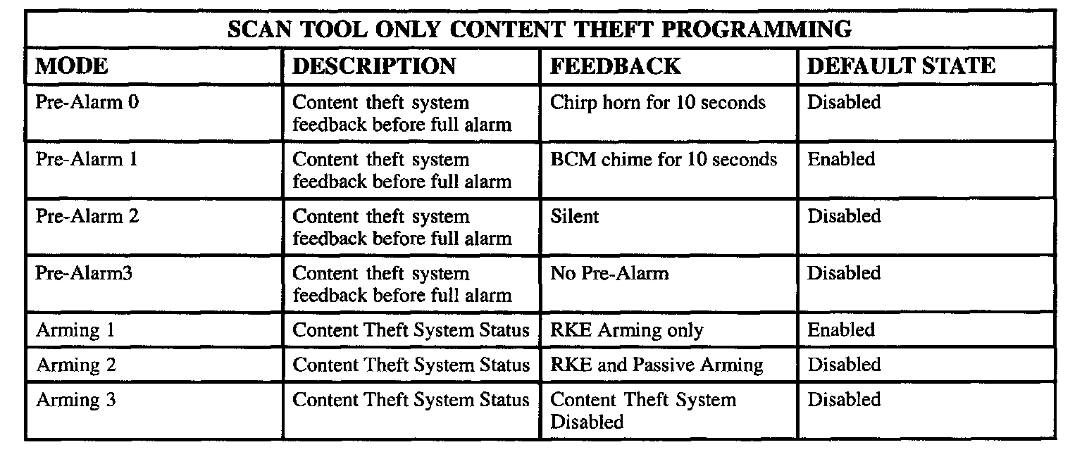Passive-Content theft system will arm 5 minutes after ignition is Off, all doors and trunk are closed. Any door open will reset 5 minute timer.