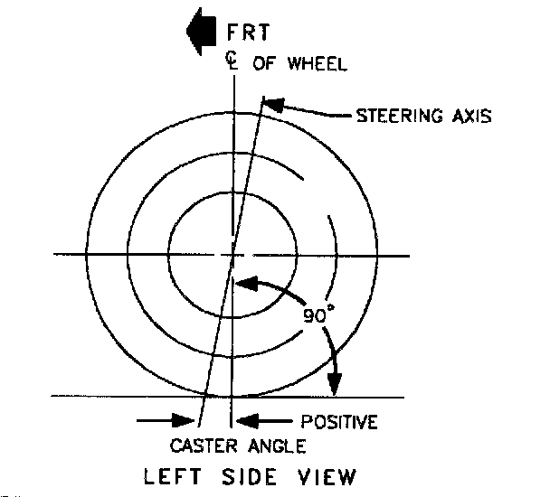 Caster is a measure of the angle between the steering axis and vertical when viewed from the side of the vehicle with the wheel in the straight ahead position. The steering axis is determined by the location of the lower control arm ball joint and the center of the strut-to-body attachment. A line drawn through the center of the ball joint and the strut-to-body joint represents the steering axis. When the center point of the strut-to-body attachment is rearward of the ball joint, the caster is positive. When the center of the strut-to-body attachment is forward of the ball joint, the caster is negative.