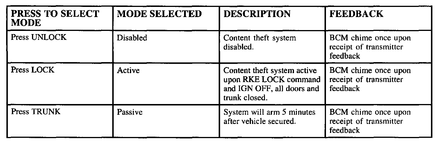 Active - Content theft system will only be armed by using the transmitter to lock the doors.