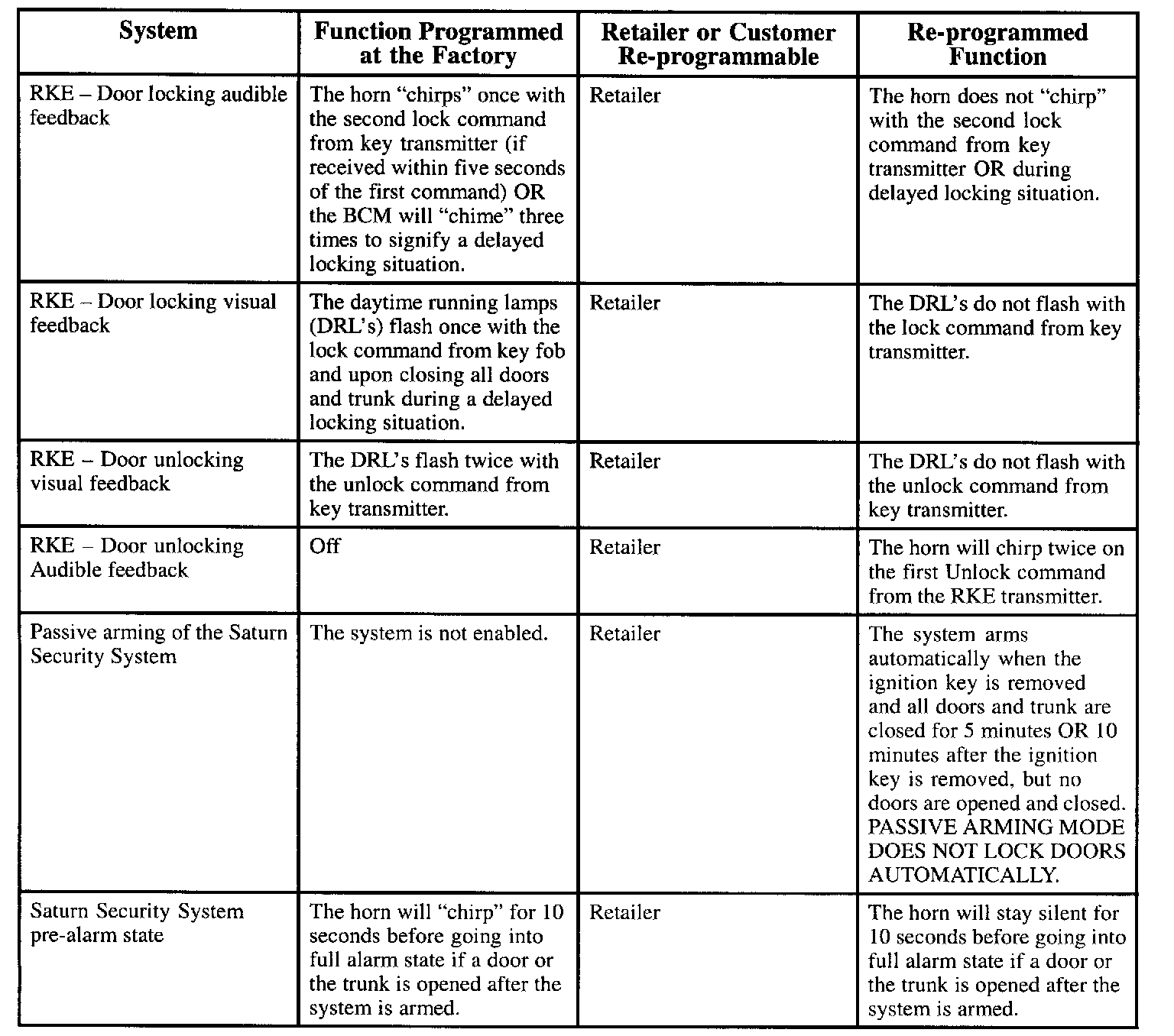 RKE Audible Programmable Features: