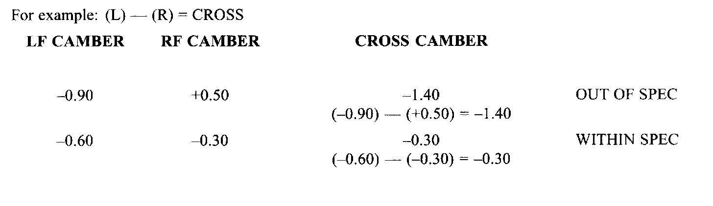 Cross camber and cross caster specifications refer to the difference between the left and right side angles. Cross camber and cross caster can influence vehicle steering pull tendencies. Usually, alignment results will be best when these measurements are as close to zero as possible.