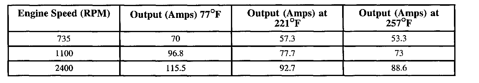 Generator output depends on electrical demand (load), generator temperature and engine speed. When using a charging system tester or a carbon pile tester (carbon pile fully On), the load will be approximately maximum load. The values given below are normal output approximations for SUV generators (generator temperature at 77°F (250°C), 221°F (105°C) and 257°F (125°C))