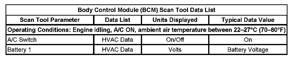 Use the Scan Tool Data Display Values and Definitions Information in order to assist in diagnosing the HVAC Control Assembly problems. Compare the vehicles actual scan tool data with the typical data display value table information. Use the data information in order to aid in understanding the nature of the problem when the vehicle does not match with the typical data display values.