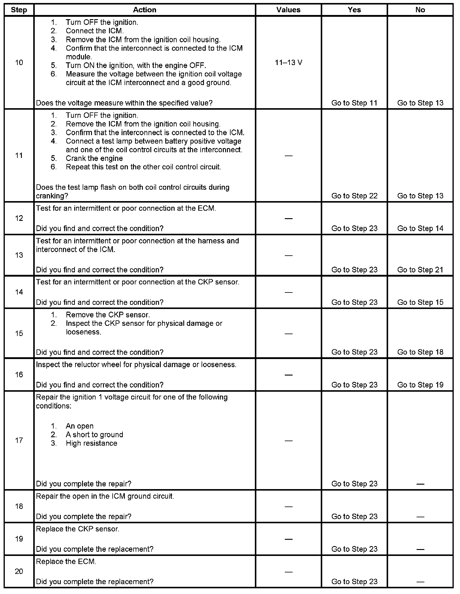 Each ignition coil supplies secondary voltage to a pair of spark plugs. This is called a waste spark ignition system. The engine control module (ECM) supplies ignition control (IC) signals to the ignition control module (ICM). The ICM fires the correct ignition coil at the correct time based on the IC signals. The ICM detects if cylinder 1 or cylinder 3 is on the compression stroke by sensing the secondary voltage and polarity of each side of the ignition coil. The higher voltage is on the compressing cylinder. The ICM provides a synthesized cam signal to the ECM based on these inputs. This is called compression sense ignition. The ECM uses the cam signals to synchronize fuel injection. This system consists of the following circuits: