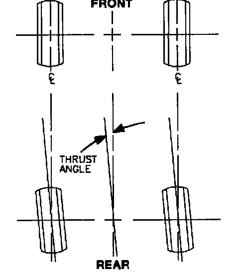 Thrust angle is the angle between the geometric centerline of the vehicle and the direction that the rear wheels track. Ideally, the thrust angle is equal to zero.