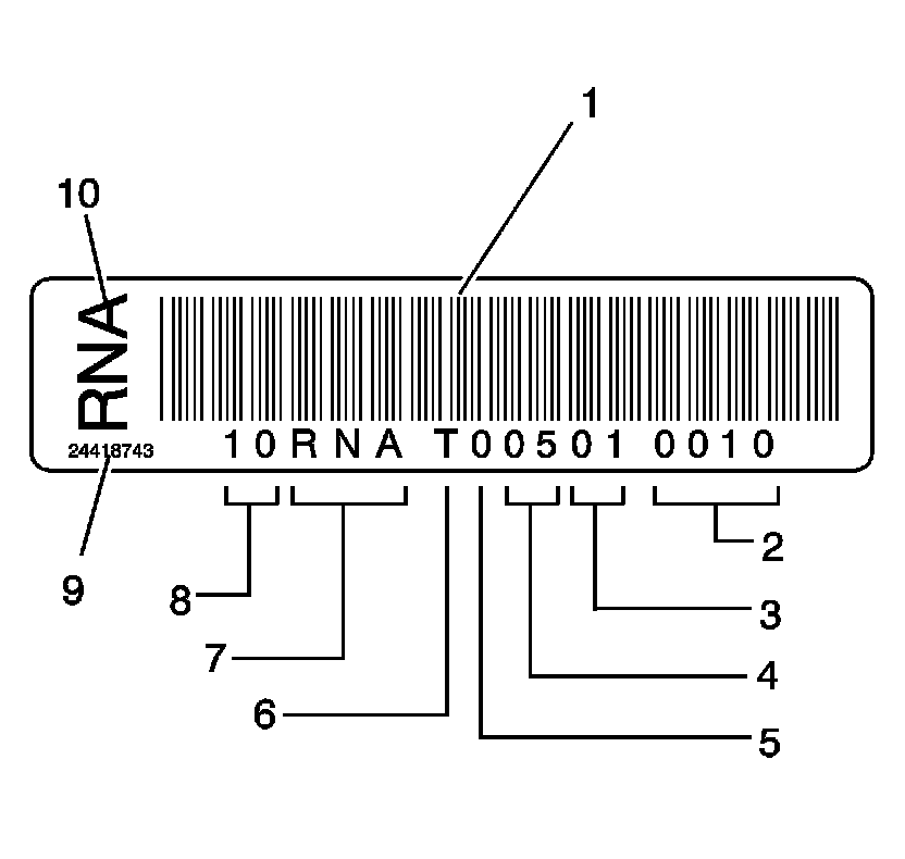 Identification can be made through the use of the Broadcast Code label on the engine front cover (1) and the use of the partial VIN etched on the oil filter bowl (2).