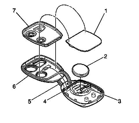 1. Insert a small flat-bladed tool between the 2 halves of the transmitter case (6,4) at the slot provided near the key ring hole (5).