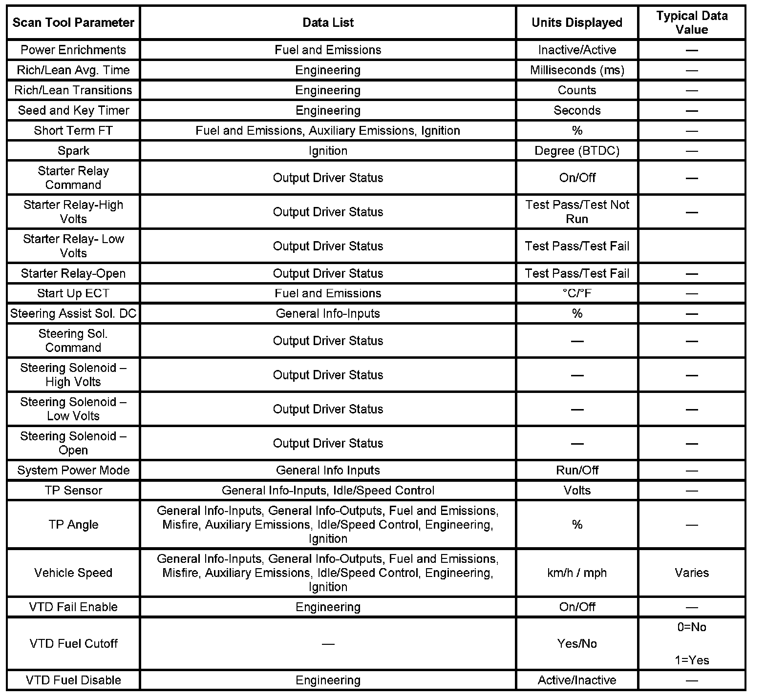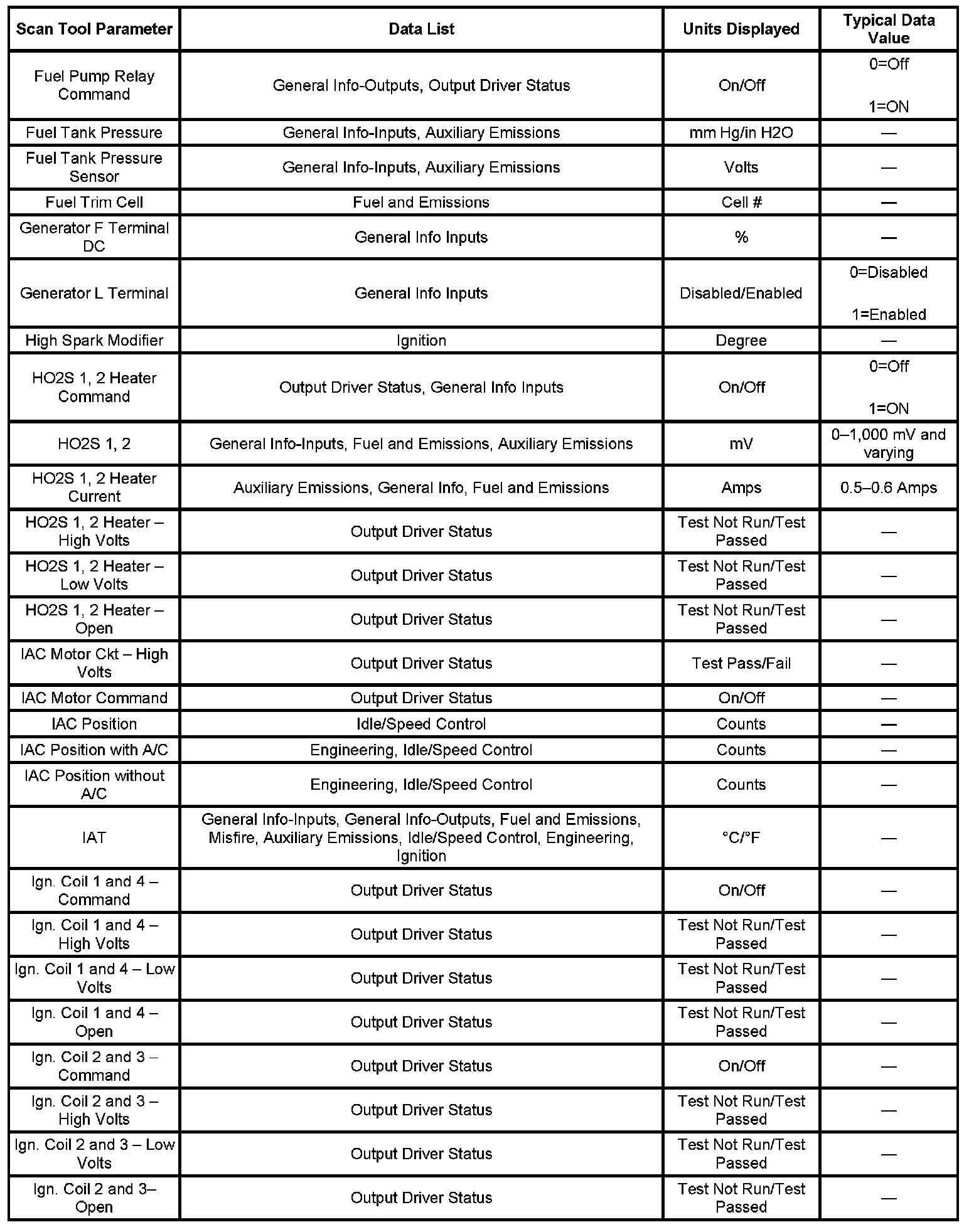The engine Scan Tool Data List contains all engine related parameters that are available on the scan tool. The list is arranged in alphabetical order. The parameters in the Typical Scan Data values column represent values that would be seen on a normally running engine.