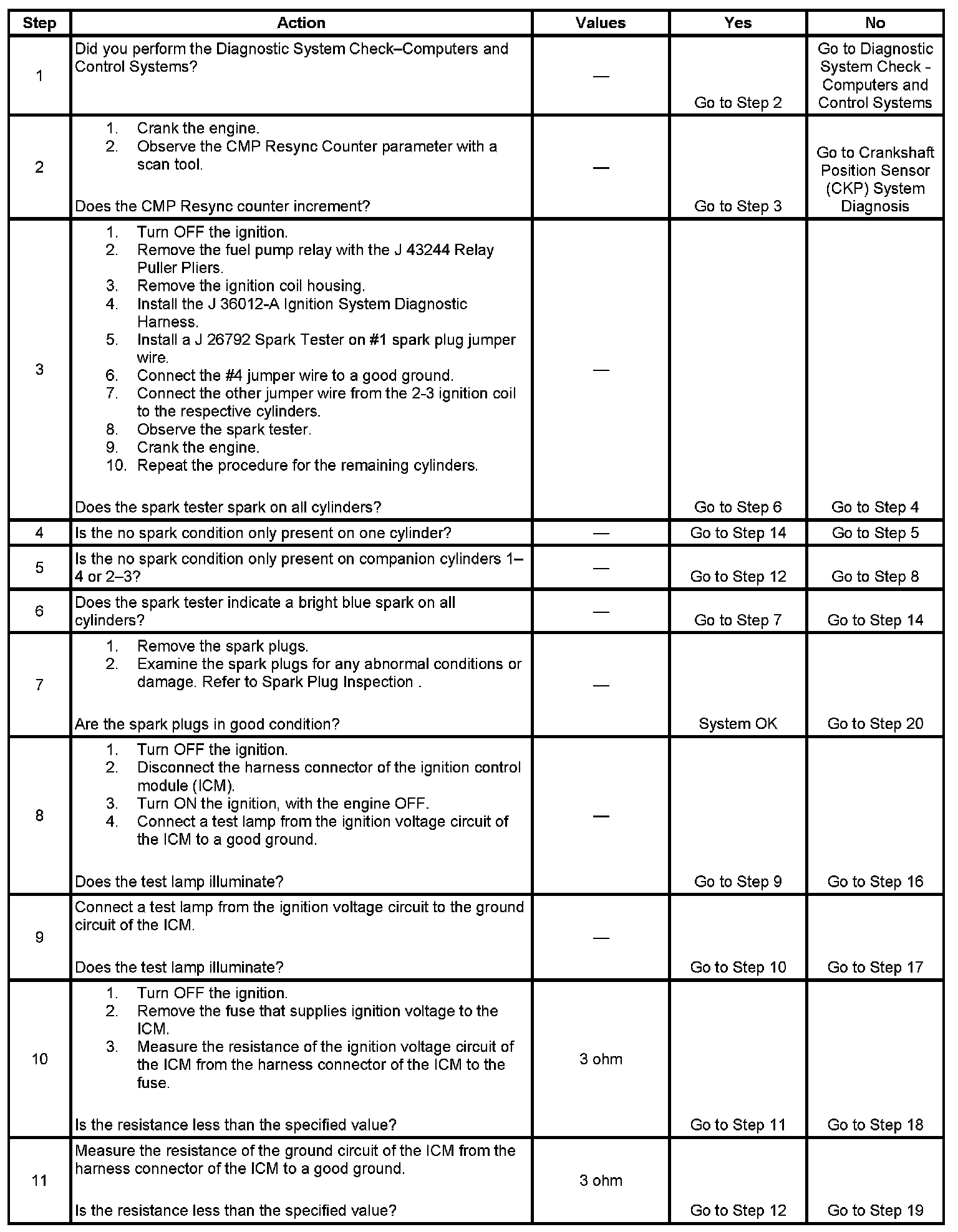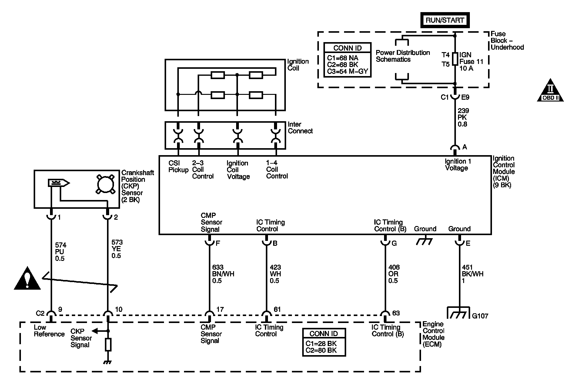 Each ignition coil supplies secondary voltage to a pair of spark plugs. This is called a waste spark ignition system. The engine control module (ECM) supplies a signal on each of the ignition control (IC) timing control circuits to the ignition control module (ICM). The ICM fires the correct ignition coil at the correct time based on the signals. The ICM detects if cylinder 1 or cylinder 3 is on the compression stroke by sensing the secondary voltage and polarity of each side of the ignition coil. The higher voltage is on the compressing cylinder. This is called compression sense ignition. The ICM provides a synthesized cam signal to the ECM based on these inputs. The ECM uses the cam signal to synchronize fuel injection. This system consists of the following circuits: