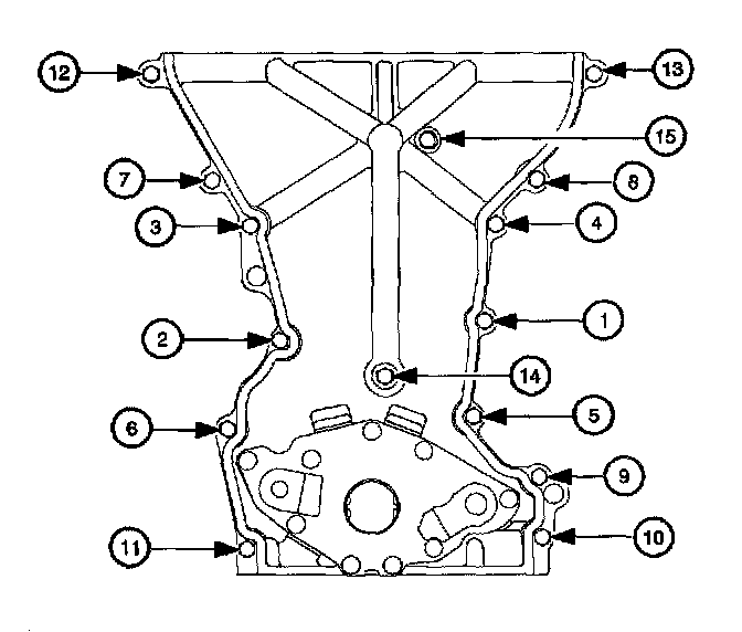Front Cover Lower Center Bolt (14) 10 Nm (89 inch lbs.)