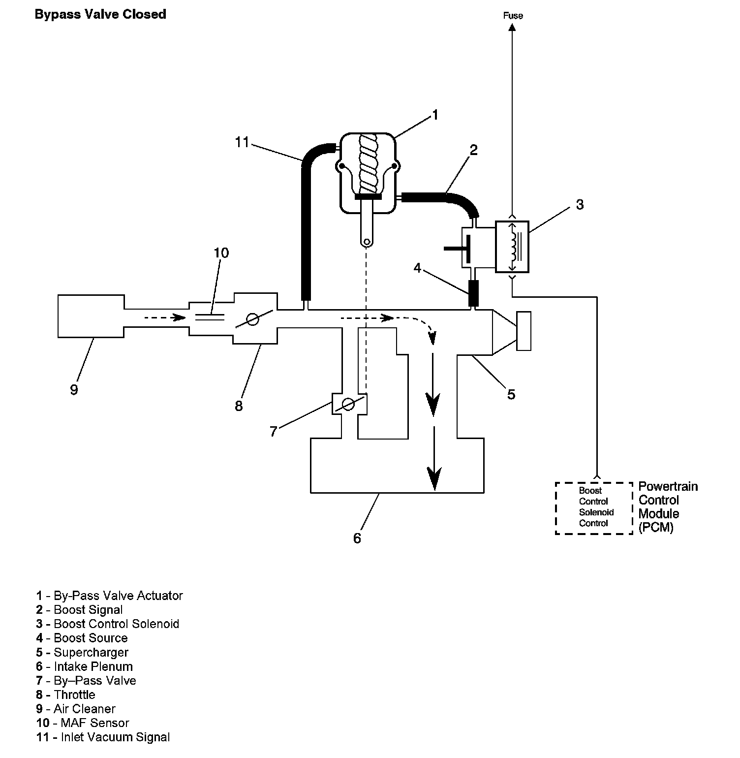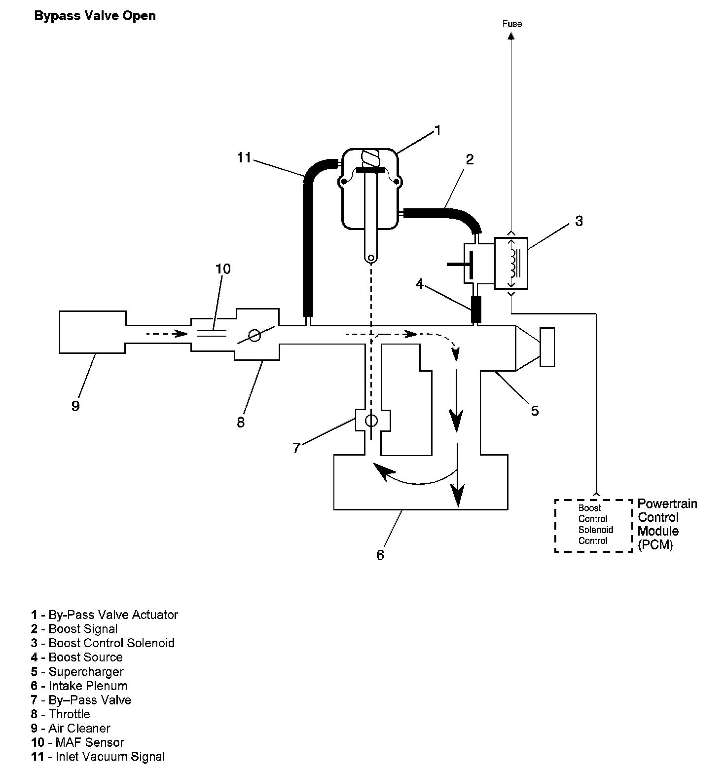 The PCM controls boost pressure by using the boost control solenoid. The boost control solenoid is normally an open valve. Under most conditions, the PCM commands the boost control solenoid to operate at a 99-100 percent duty cycle. This keeps the solenoid valve closed and allows only inlet vacuum to control the position of the bypass valve. At idle, engine vacuum is applied to the upper side of the bypass valve actuator, counteracting spring tension to hold the bypass valve open. As engine load is increased, engine vacuum is decreased, causing the spring in the bypass valve actuator to overcome the applied vacuum, closing the bypass valve and allowing the boost pressure to increase. The bypass valve starts to close when the vacuum measures 250 mm Hg (10 in Hg) and is fully closed at 90 mm Hg (3.5 in Hg). When reduced boost pressure is desired, the PCM commands the boost control solenoid to operate at a 0 percent duty cycle. This opens the solenoid valve and allows boost pressure to enter the bypass valve actuator at the lower side to counteract the spring tension, opening the bypass valve and recirculating excess boost pressure back into the supercharger inlet.