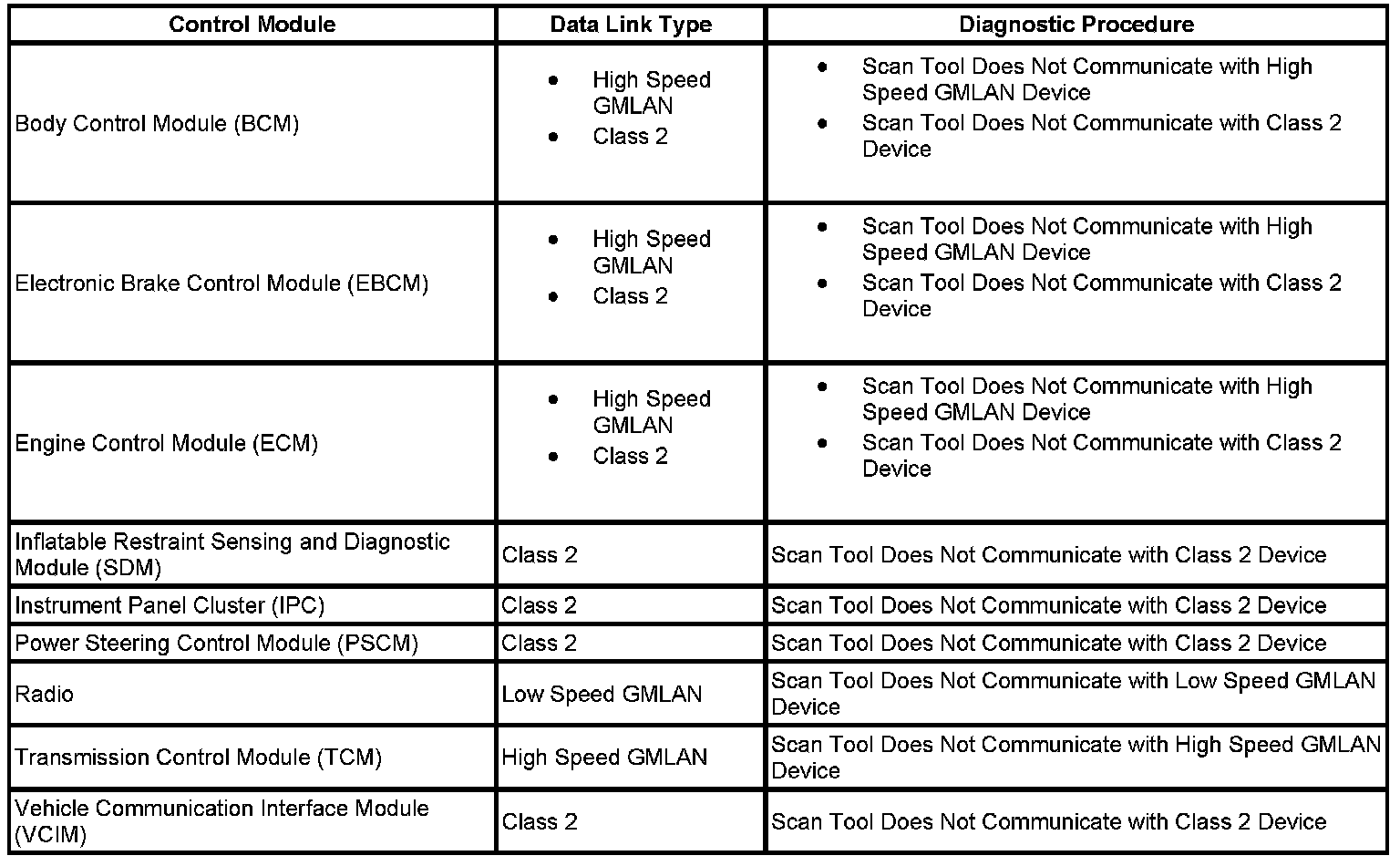 This table identifies which serial data link that a particular module uses for in-vehicle data transmission. Some modules may use more than one data link to communicate. Some modules may have multiple communication circuits passing through them without actively communicating on that data link. This table is used to assist in correcting a communication malfunction. For the description and operation of these serial data communication circuits refer to Data Link Communications Description and Operation.