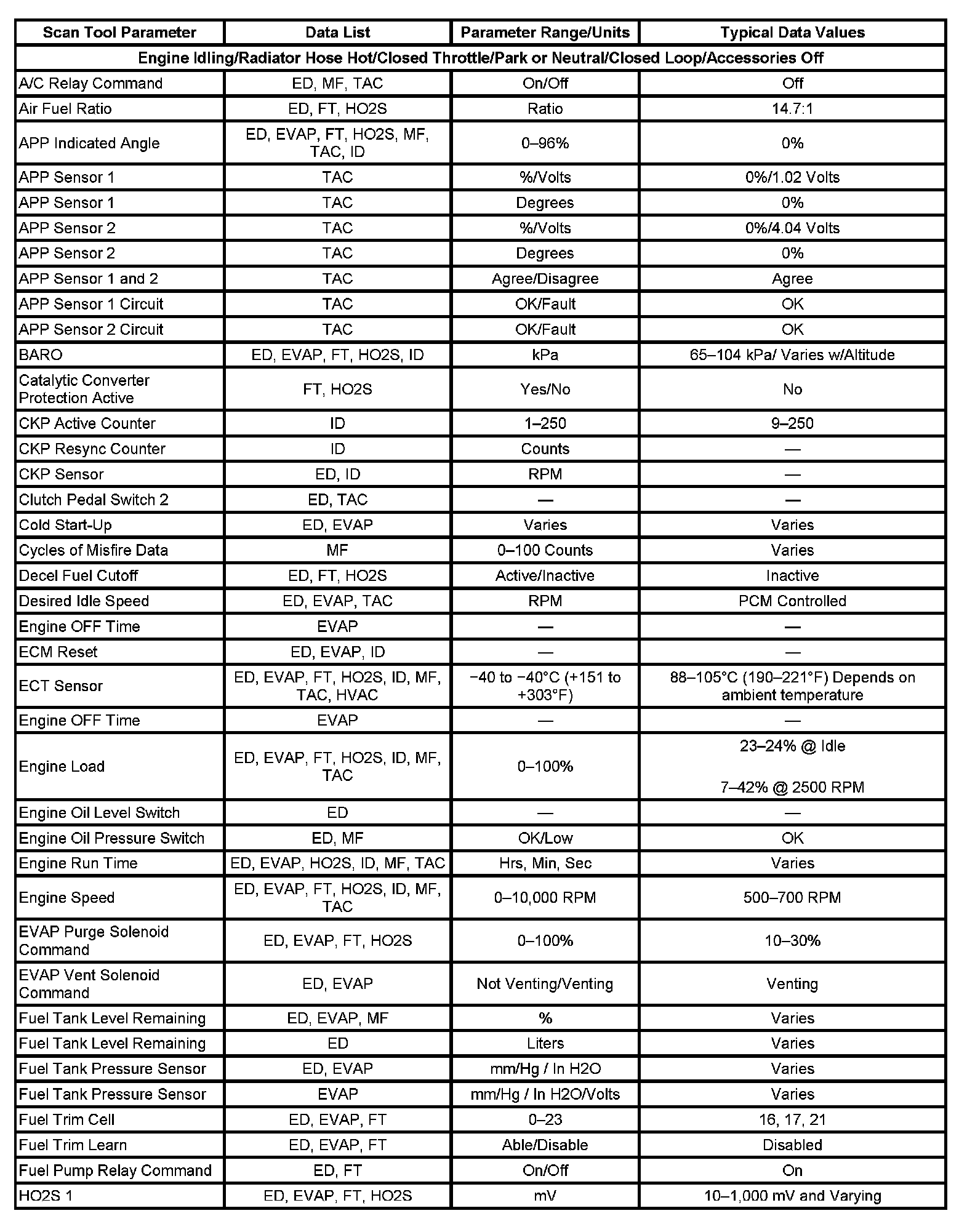 The Engine Scan Tool Data List contains all engine related parameters that are available on the scan tool. The list is arranged in alphabetical order. A given parameter may appear in any one of the data lists, and in some cases may appear more than once, or in more than one data list in order to group certain related parameters together.