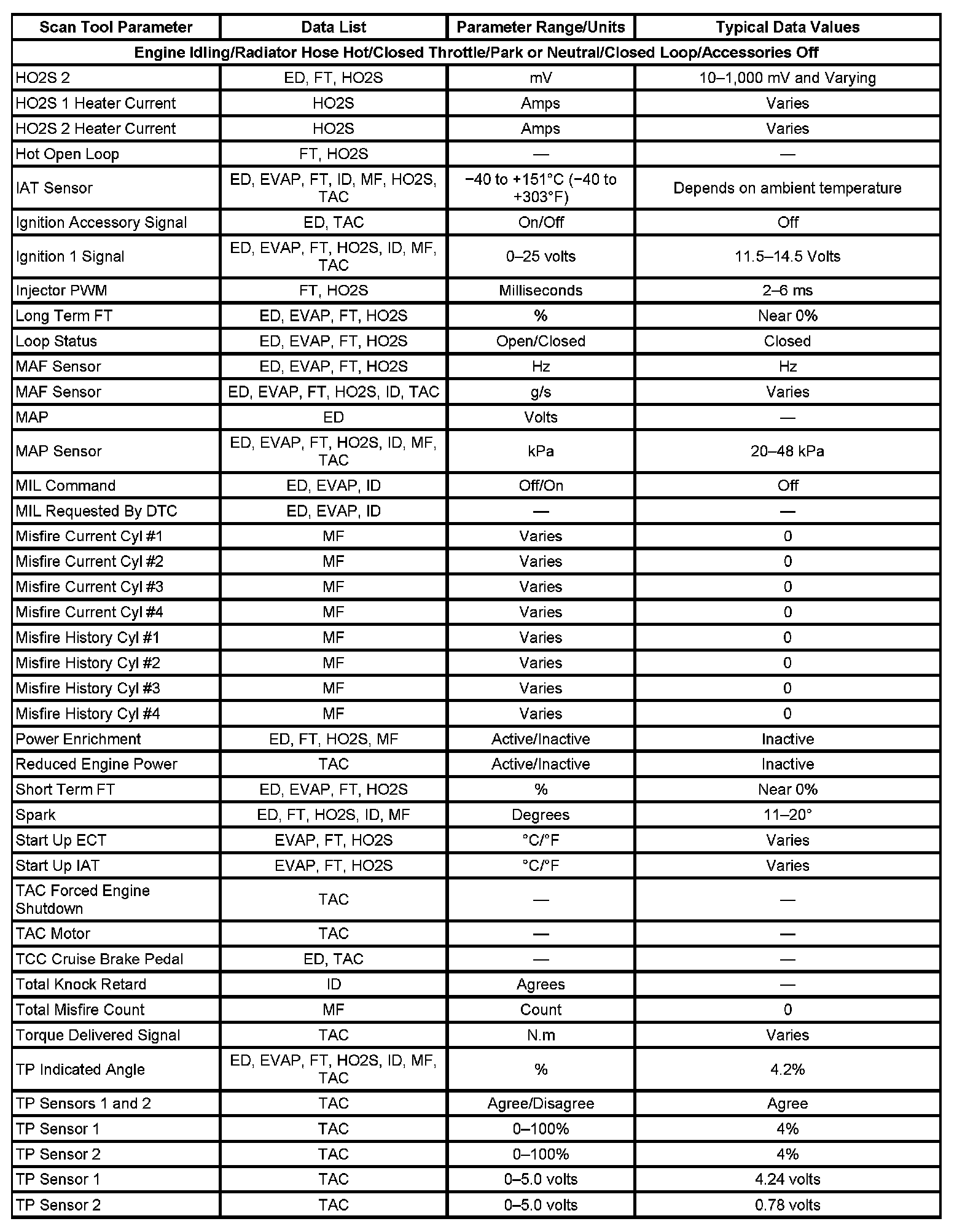 Scan tool values from a properly running engine may be used for comparison with the engine you are diagnosing. The Engine Scan Tool Data List represents values that would be seen on a normal running engine.
