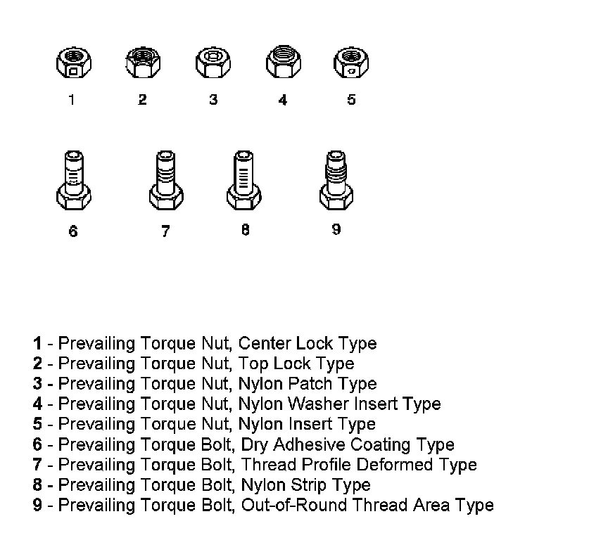 These fasteners accomplish the thread interface by the presence of a thread-locking compound on the fastener threads. Refer to the appropriate repair procedure in order to determine if the fastener may be reused and the applicable thread-locking compound to apply to the fastener.