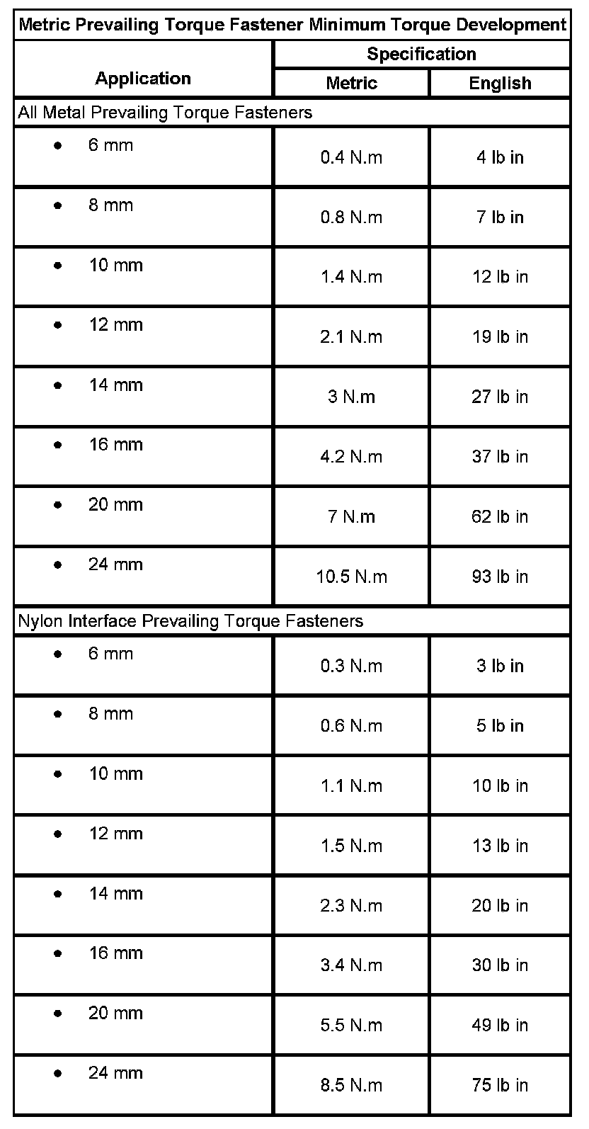 Metric Prevailing Torque Fastener Minimum Torque Development: