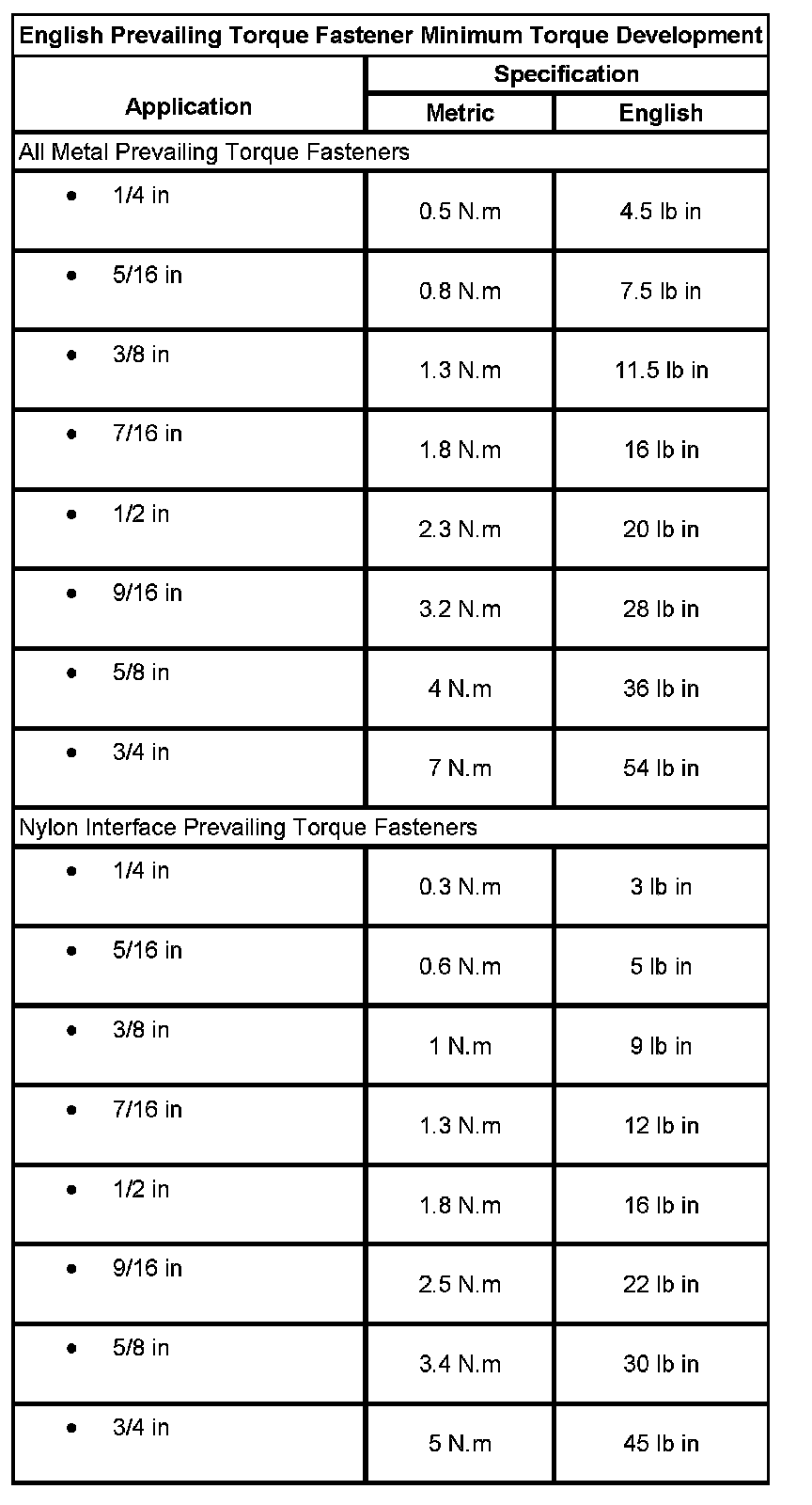 English Prevailing Torque Fastener Minimum Torque Development: