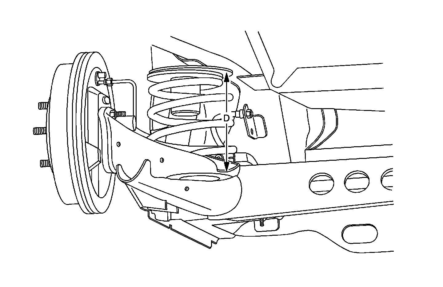 4. Measure the D height for the left and right side of the vehicle. Measure the vertical distance between the bottom edge of the upper spring seat to the bottom of the notch in the lower spring seat.