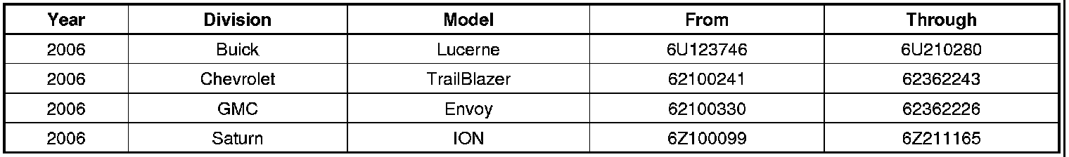 Involved are certain 2006 model year Buick Lucerne vehicles equipped with a 4.6L V8 engine (LD8 - VIN Y); 2006 model year Chevrolet TrailBlazer and GMC Envoy vehicles equipped with a 4.2L I-6 engine (LL8 - VIN S); and 2006 model year Saturn ION vehicles equipped with a 2.2L 4-cylinder engine (L61 - VIN F) registered in California, and built within these VIN breakpoints: