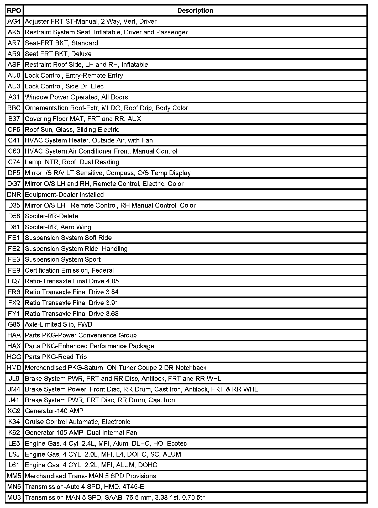 RPO Code List