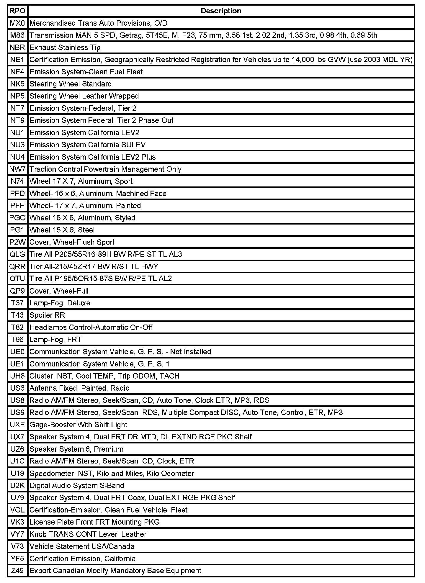 The following table provides the description of the Regular Production Option (RPO) codes that are available on the vehicle. The vehicle RPO list is printed on the Service Parts Identification Label.