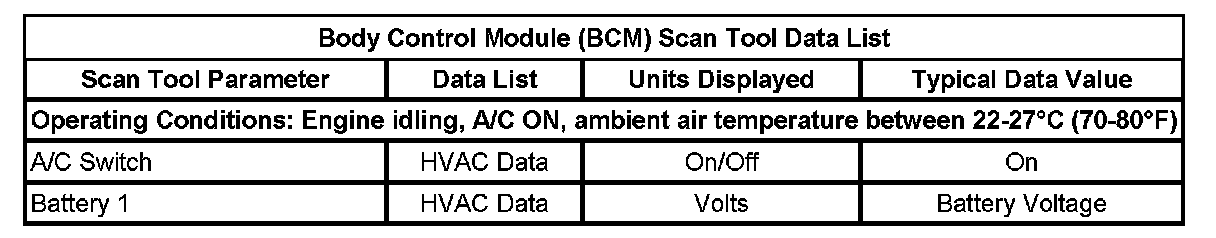Use the Scan Tool Data Display Values and Definitions Information in order to assist in diagnosing the HVAC control assembly problems. Compare the vehicles actual scan tool data with the typical data display value table information. Use the data information in order to aid in understanding the nature of the problem when the vehicle does not match with the typical data display values.