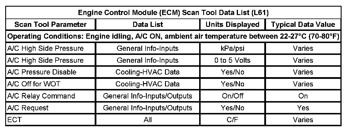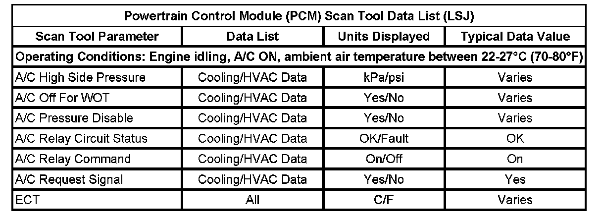The scan tool data values were taken from a known good vehicle under the following conditions: