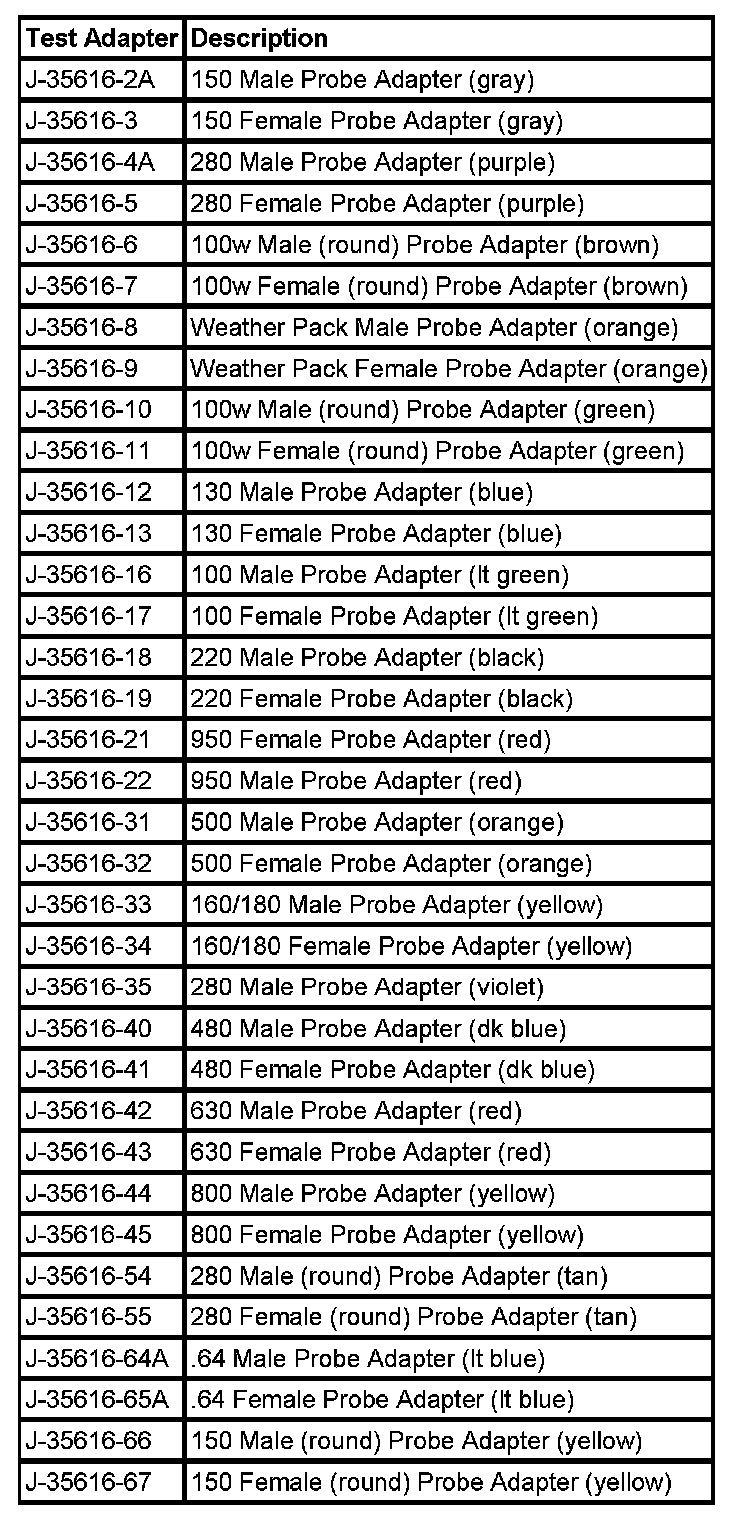 When using the J 35616 GM-Approved Terminal Test Kit, ensure the terminal test adapter choice is the correct size for the connector terminal. Do not visually choose the terminal test adapter because some connector terminal cavities may appear larger than the actual terminal in the cavity. Using a larger terminal test adapter will damage the terminal. Refer to the J 35616 GM-Approved Terminal Test Kit label on the inside of the J 35616 GM-Approved Terminal Test Kit for the correct adapter along with the connector end view for terminal size. Refer to the table as guide in selecting the correct test adapter for frontprobing connectors.