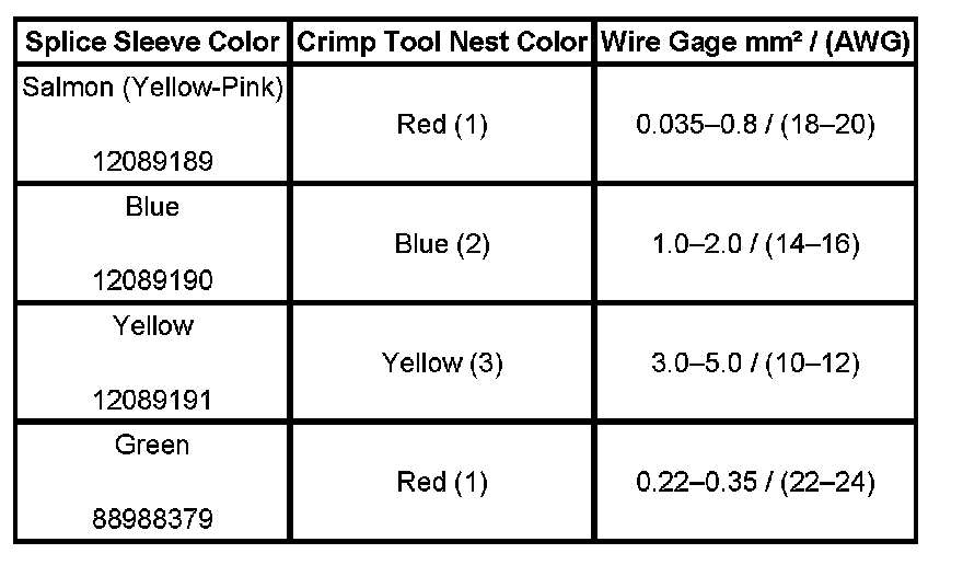 4. Select the proper DuraSeal splice sleeve according to the wire size. Refer to the above table at the beginning of the repair procedure for the color coding of the DuraSeal splice sleeves and the crimp tool nests.