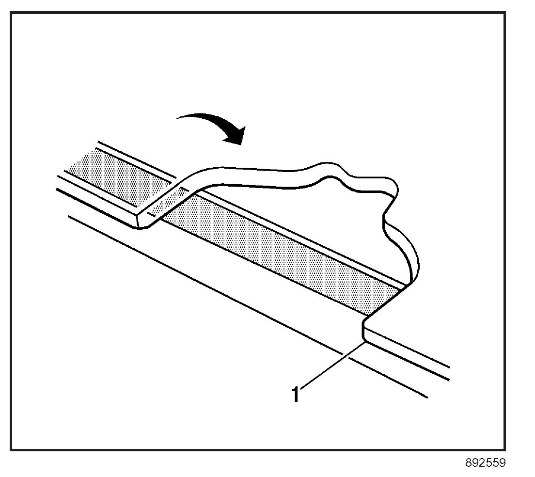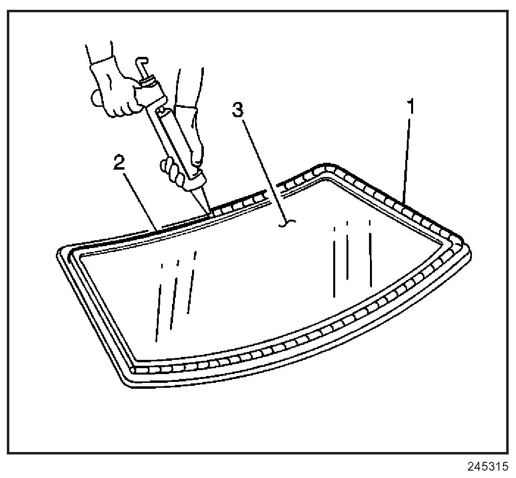IMPORTANT: Do not apply the black #3 primer to the existing bead (1) of the urethane adhesive on the pinch-weld flange. Apply the primer only to nicks, scratches or the primed surfaces.