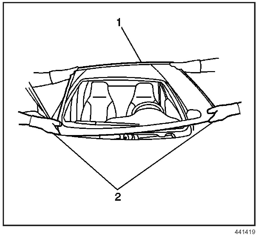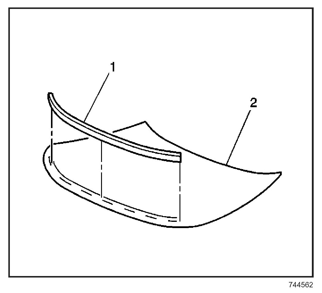 12. Install the new windshield acoustic strip (1) to the windshield (2), if equipped or damaged. The acoustic strip aids in reducing noise.
