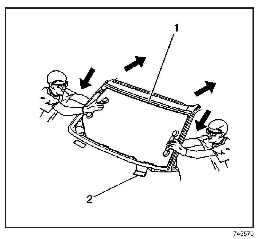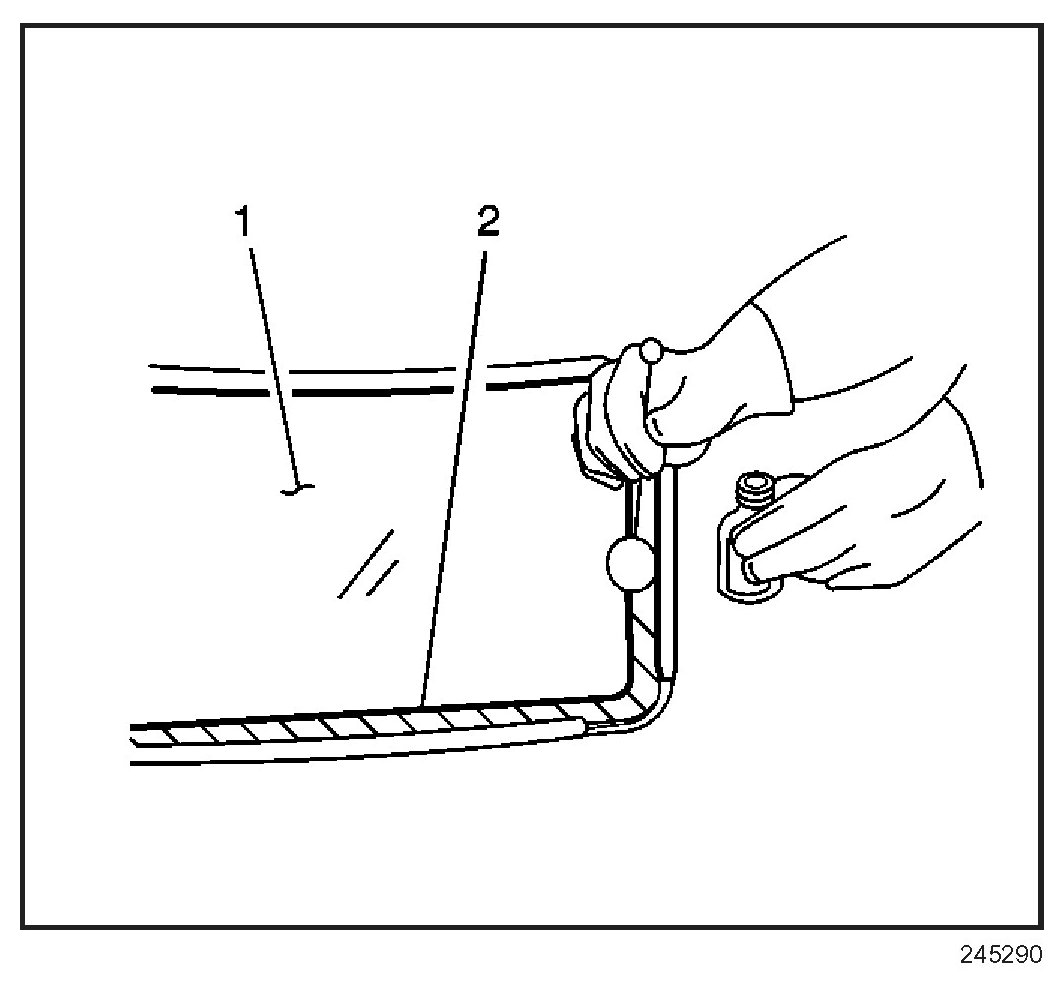 25. With the aid of an assistant, place the window in the opening. If installing a windshield, place the windshield on the lower supports (2), if equipped.