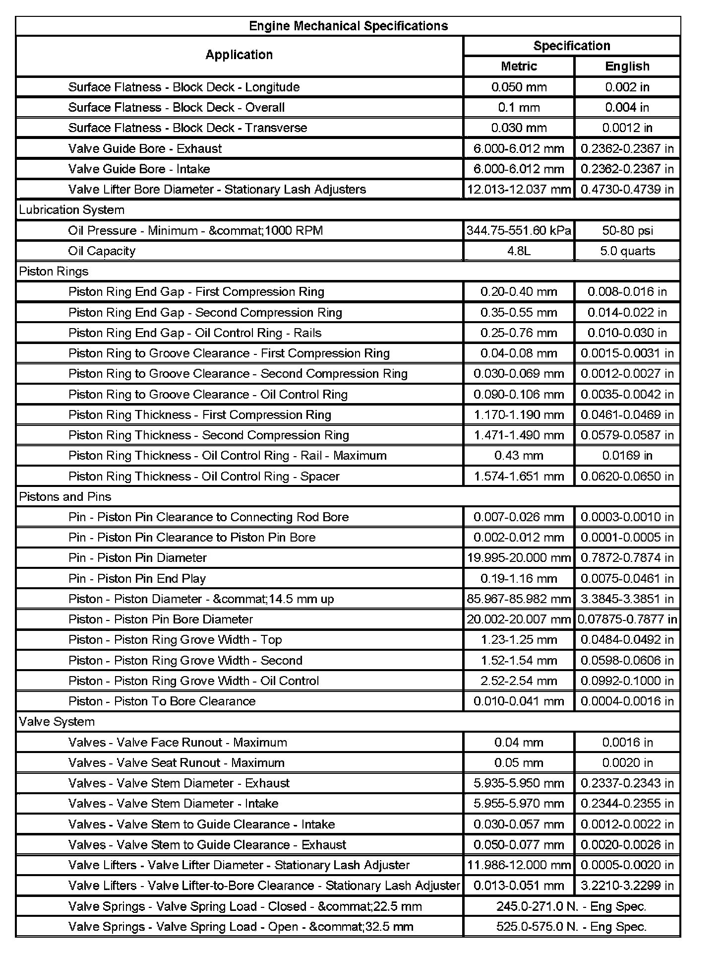 Engine Mechanical Specifications