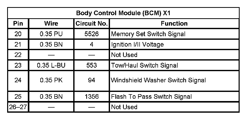 Body Control Module (BCM) X1 (Pin 20 To 27):